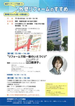 日本金属サイディング工業会様主催イベントにおいて江口がセミナー担当させていただきます。 「金属サイディングを使った外壁リフォームのすすめ」イベント 【江口講師セミナー】 「リフォームで街一番のいえづくり」 11/4(水)13:00~14:00 お問い合わせ先 日本金属サイディング工業会様 03-3639-9003