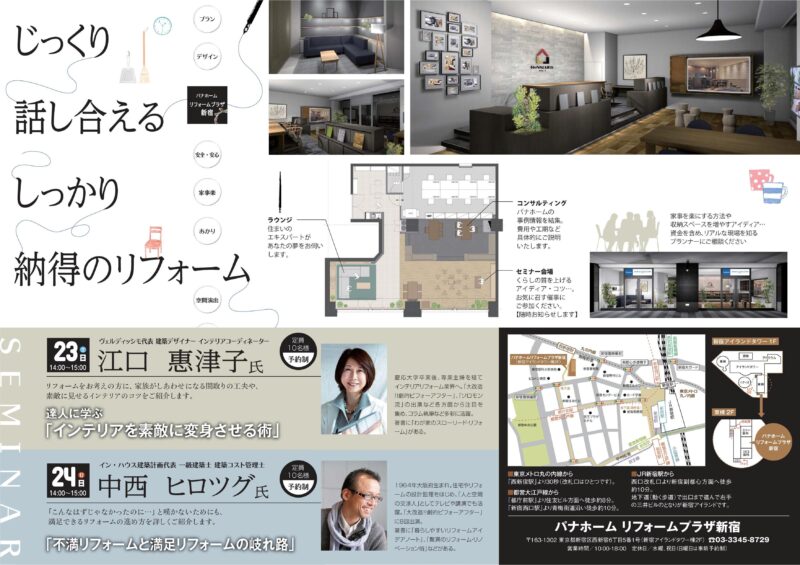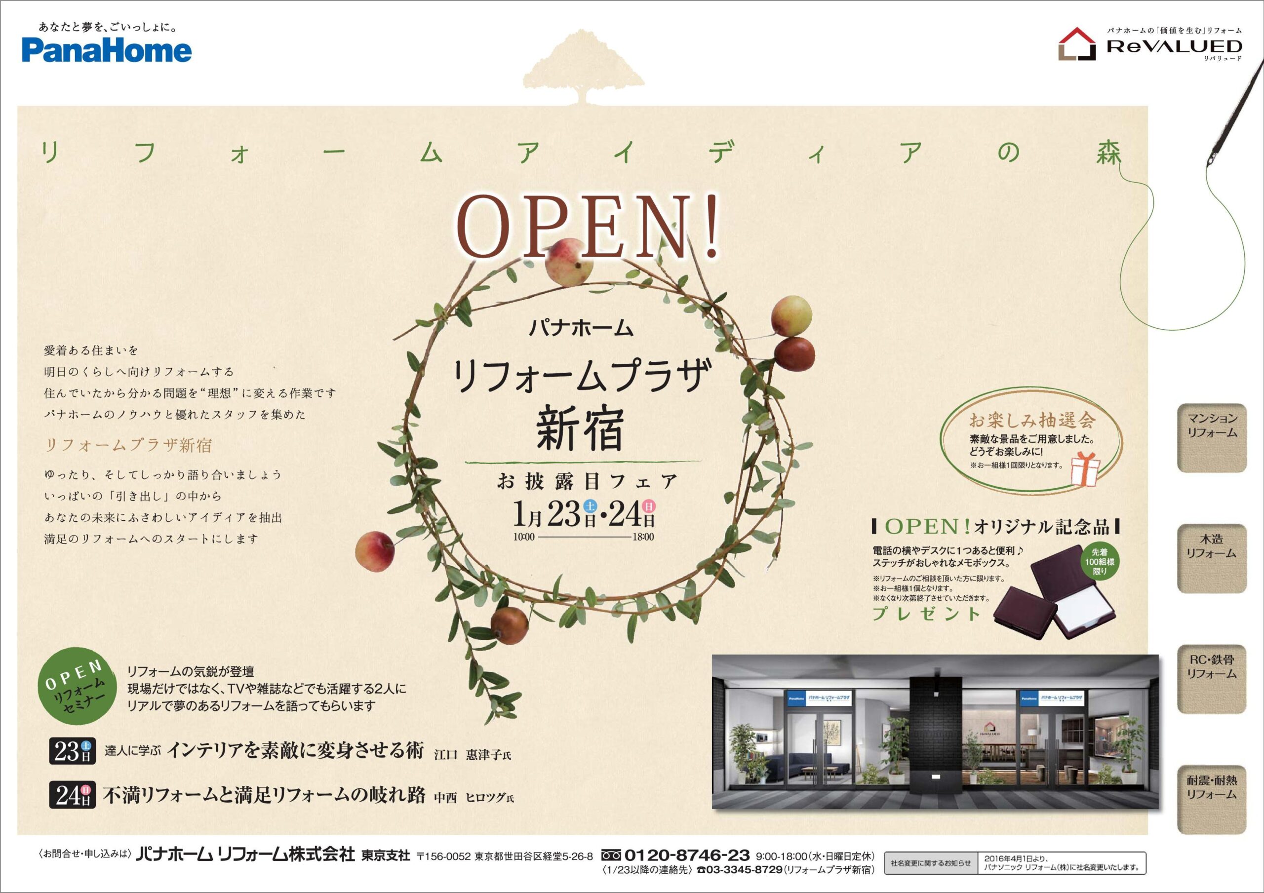 1月23日(土)パナホーム・リフォームプラザ新宿にてOPEN記念セミナー講師を務めさせて頂きます。