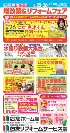 6月26日(日) 午前の部:11時~12時半 午後の部:2時~3時半 の2回 福井の石友ホーム様のリフォームフェアーにて特別セミナーをさせて頂きます。 人生を豊かにするリフォームの可能性をテーマにワクワクするリフォーム事例をご紹介 是非ご参加下さい、お待ちしております。
