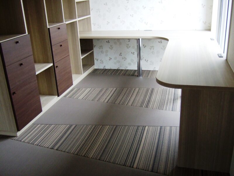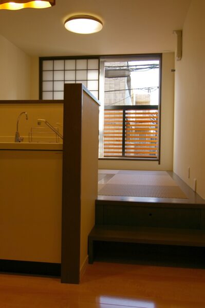 造作の棚とカウンターとおり座の畳。お尻をついて本を読むもよし!耐久性に優れたおり座は椅子をおいたってOK!(車椅子も対応可)