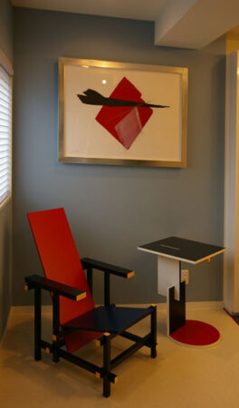 会議室と社長室を眺めの良いフロアーに新設。 社長さま所有び2枚の絵画をもとに赤と青と白の爽やかな空間をデザインしました。